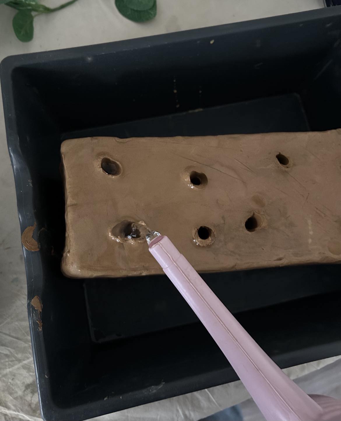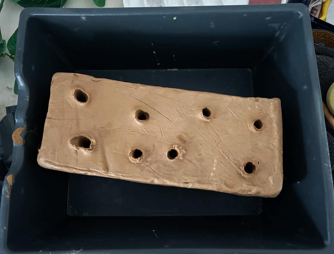 Leg het pak klei in de bak en maak er met een oude verfkwast, of een ander voorwerp wat in de harde klei kan, gaten in.