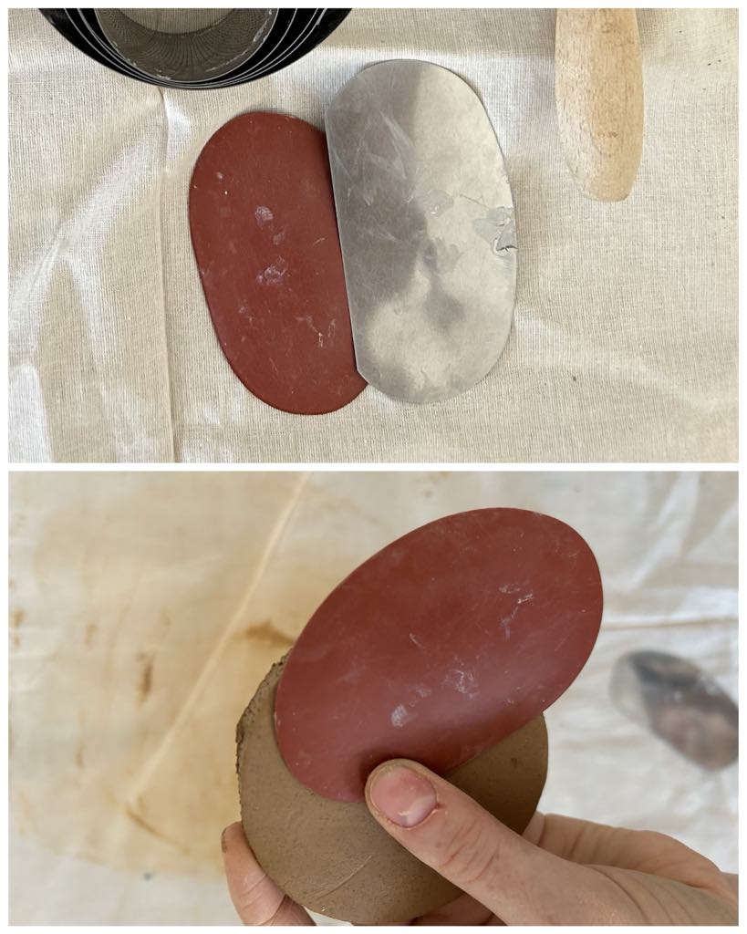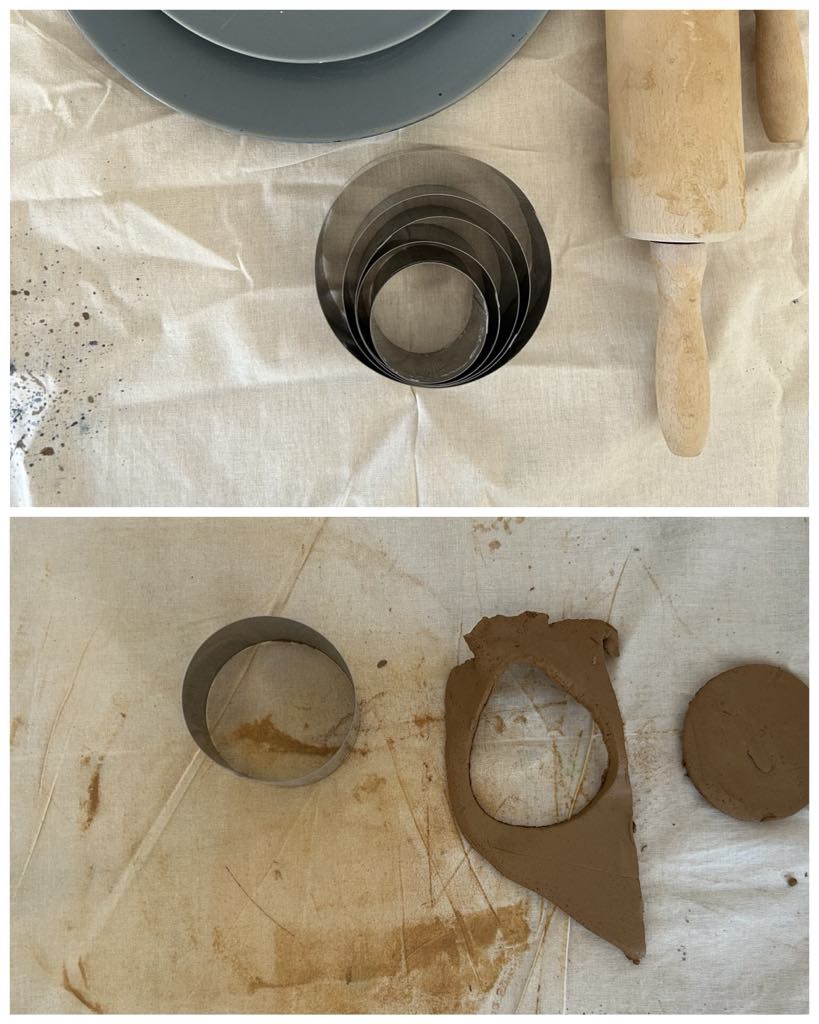 Als ik een plak klei heb uitgerold dan leg ik het bord op zijn kop erop en dan snijd ik de vorm met een mesje uit.