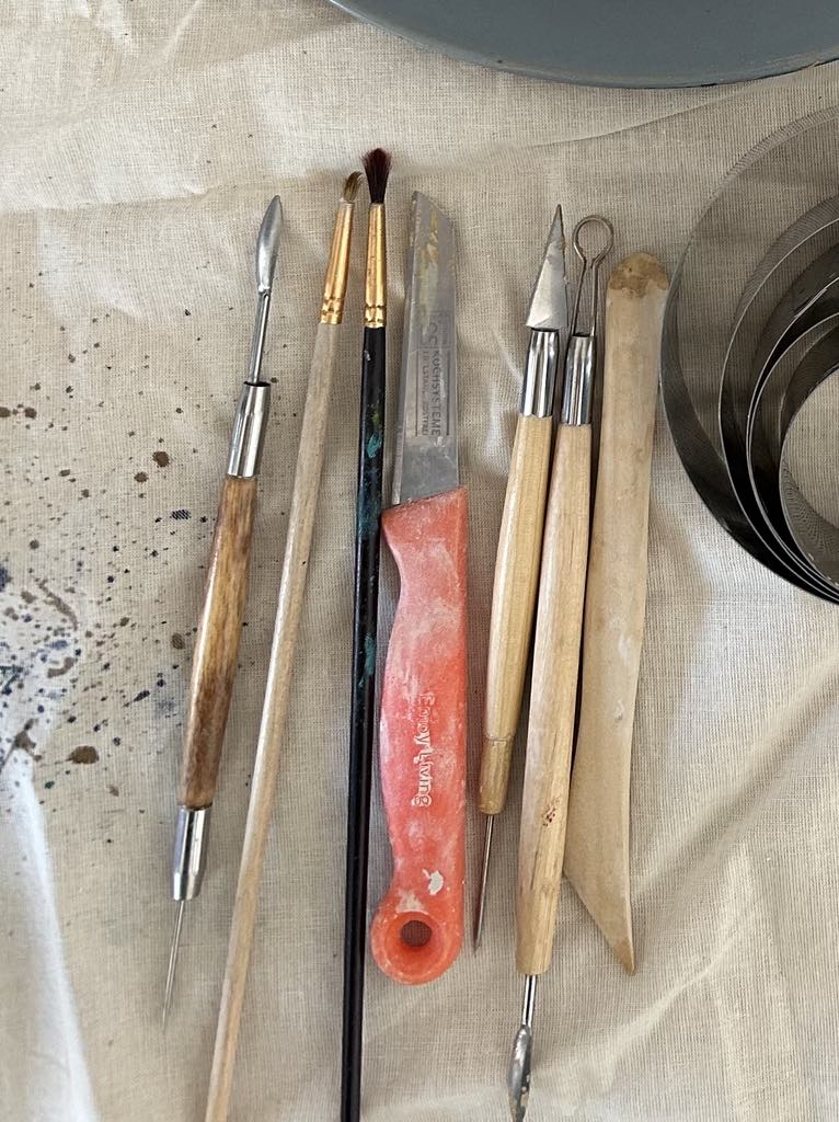 Bij het maken van de kabouterhuisjes gebruik ik divers gereedschap. Zoals keukenmesjes, penselen en boetseergereedschap. Dit gebruik je voor het snijden, uithollen, glad strijken en eventuele vormen maken.
